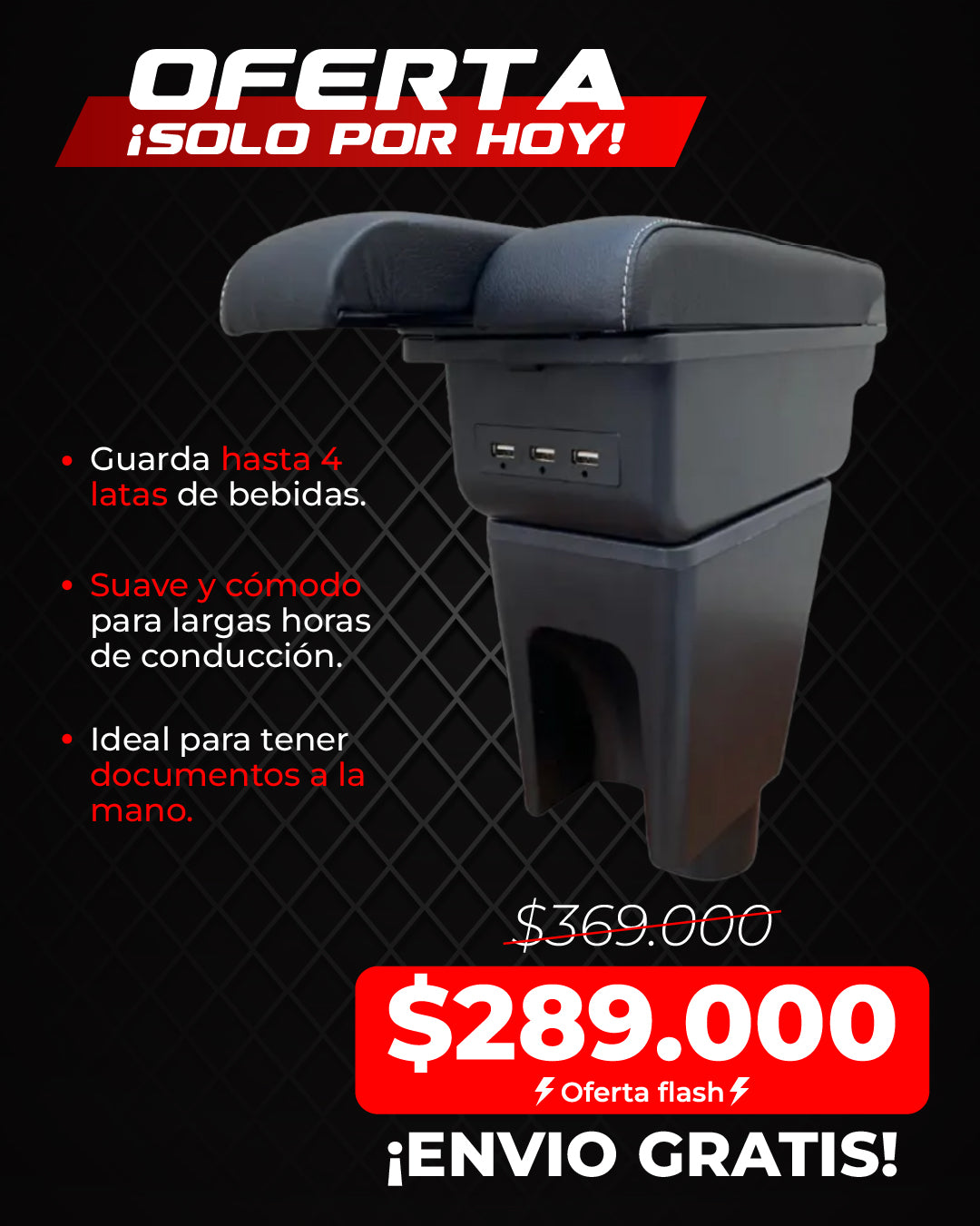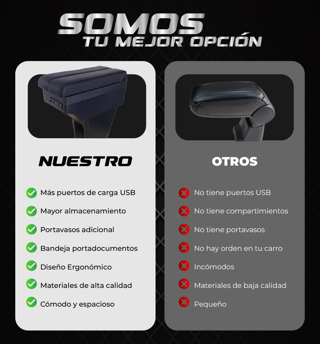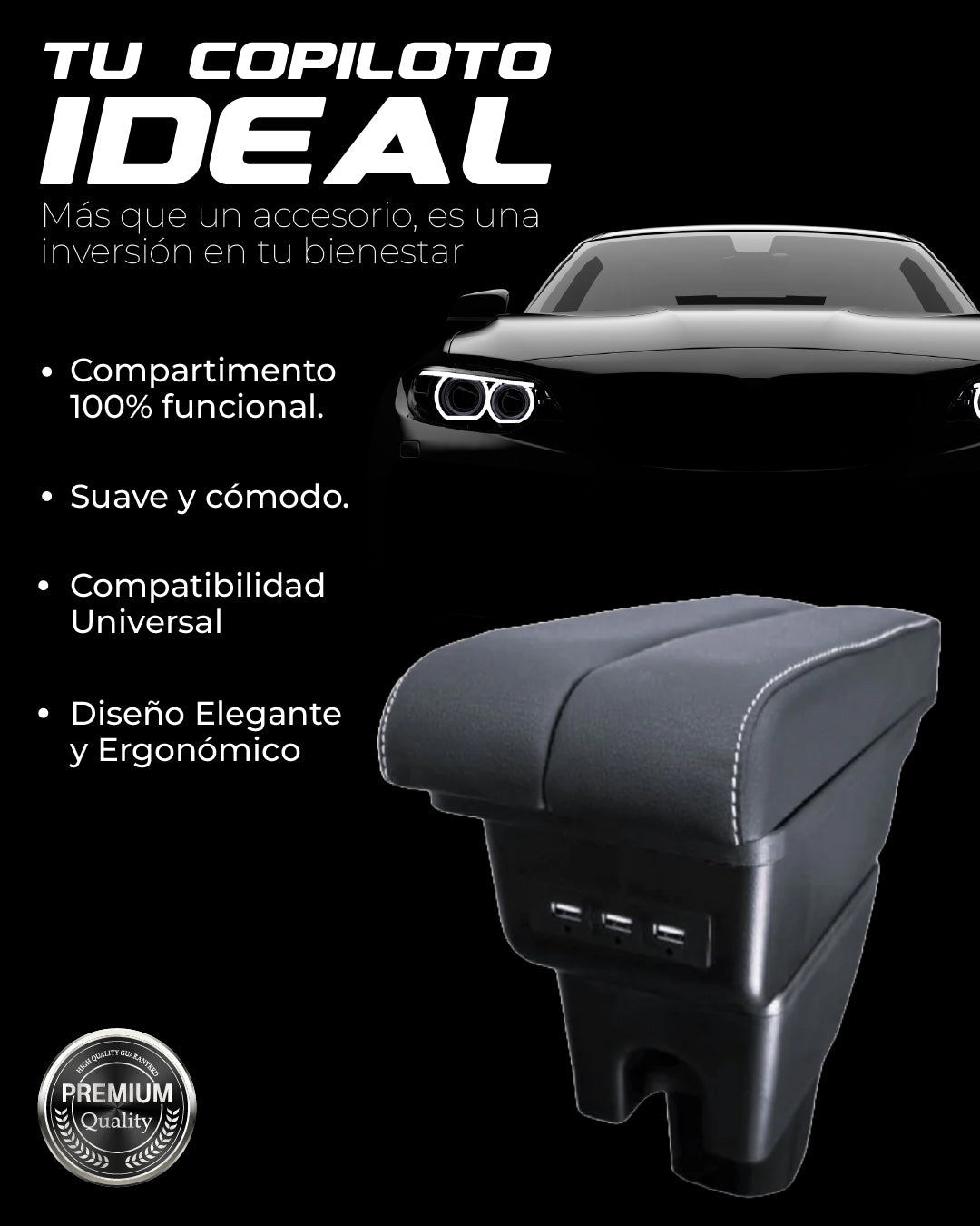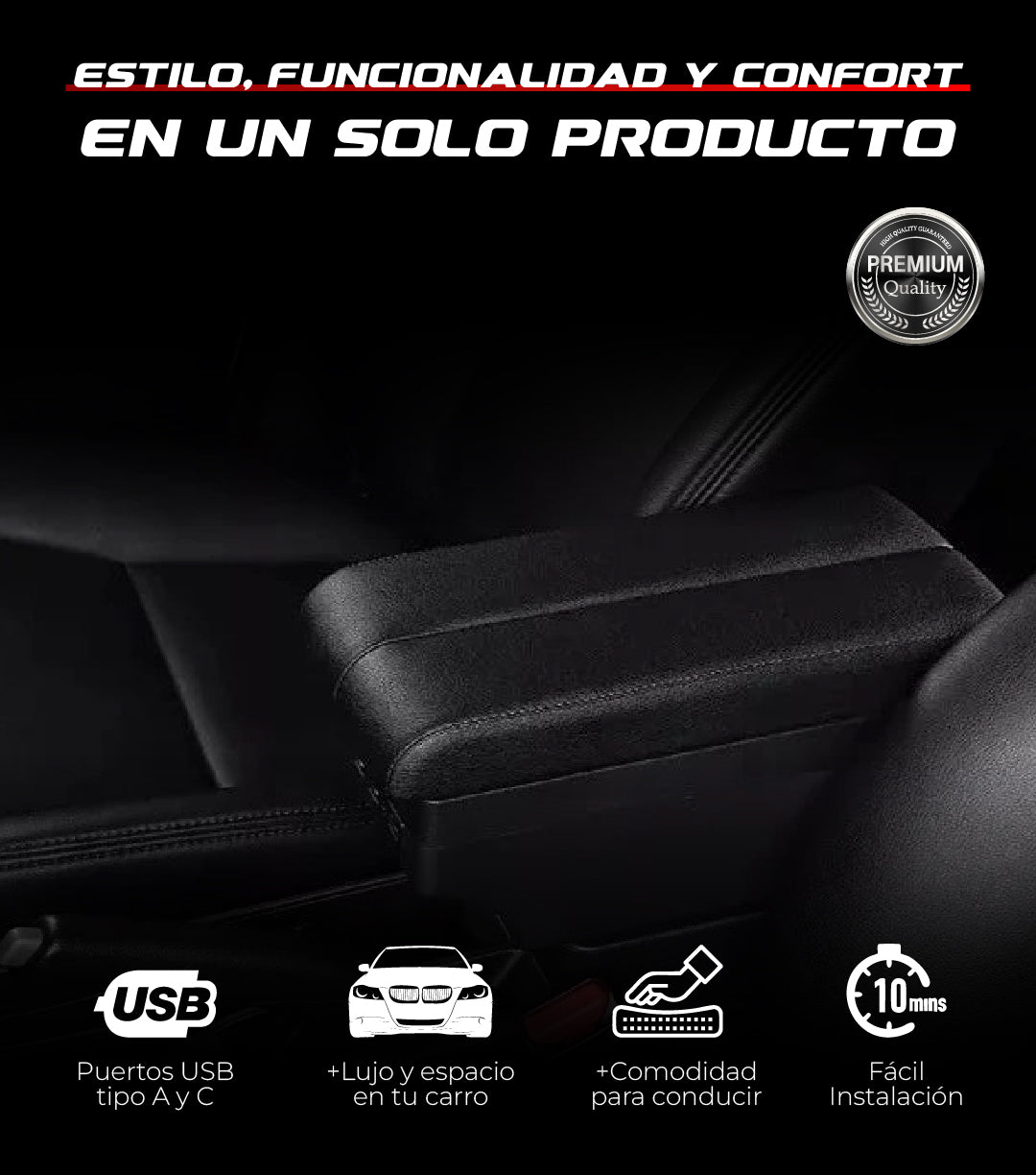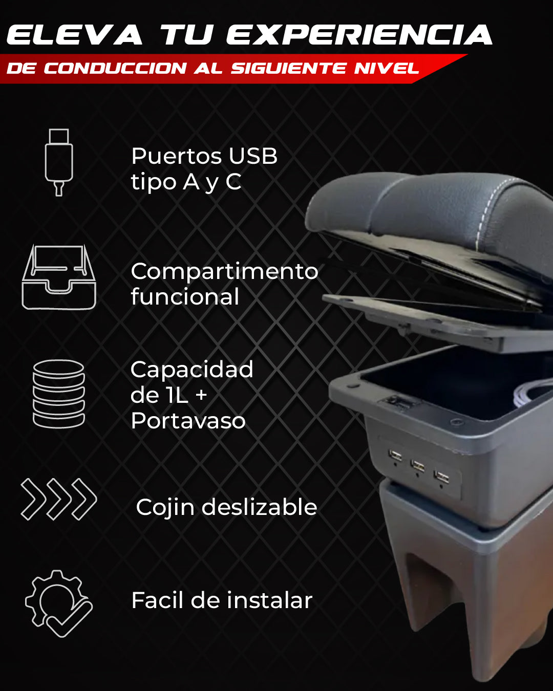 Apoyabrazos para auto de diseño ergonómico, con espacio de almacenamiento y un toque estético que mejora la experiencia dentro del vehículo.